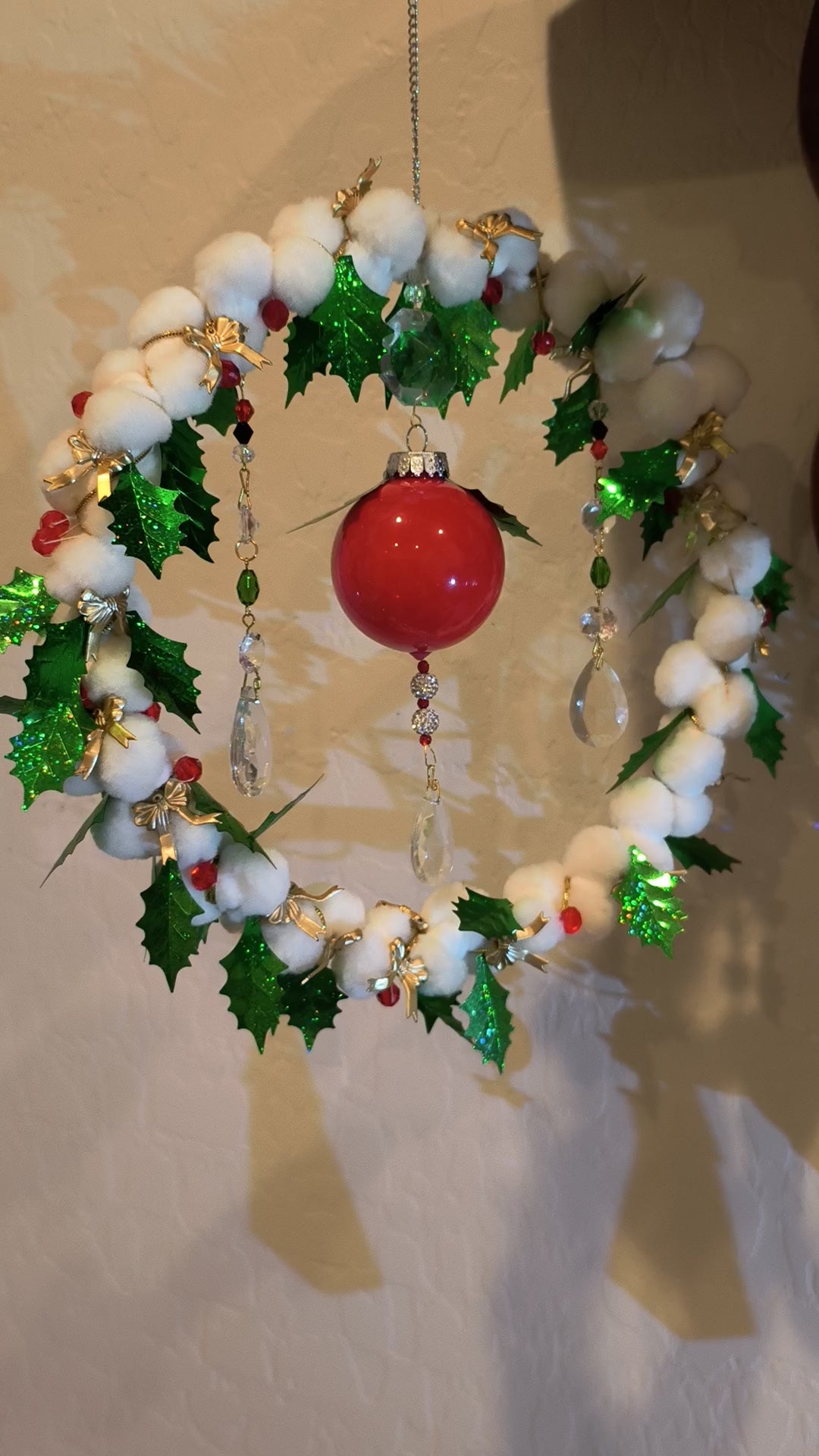 Bring a touch of festive cheer to any window with this beautiful Christmas Suncatcher. This unique piece features a wreath-like design adorned with soft, white cotton bolls and vibrant faux holly leaves, creating a cozy and natural holiday feel. At its center hangs a classic red ornament, while delicate, clear crystals dangle below, catching the light to cast sparkling reflections throughout your room. Perfect for hanging in a window, on a wall, or as a charming addition to your holiday decor.