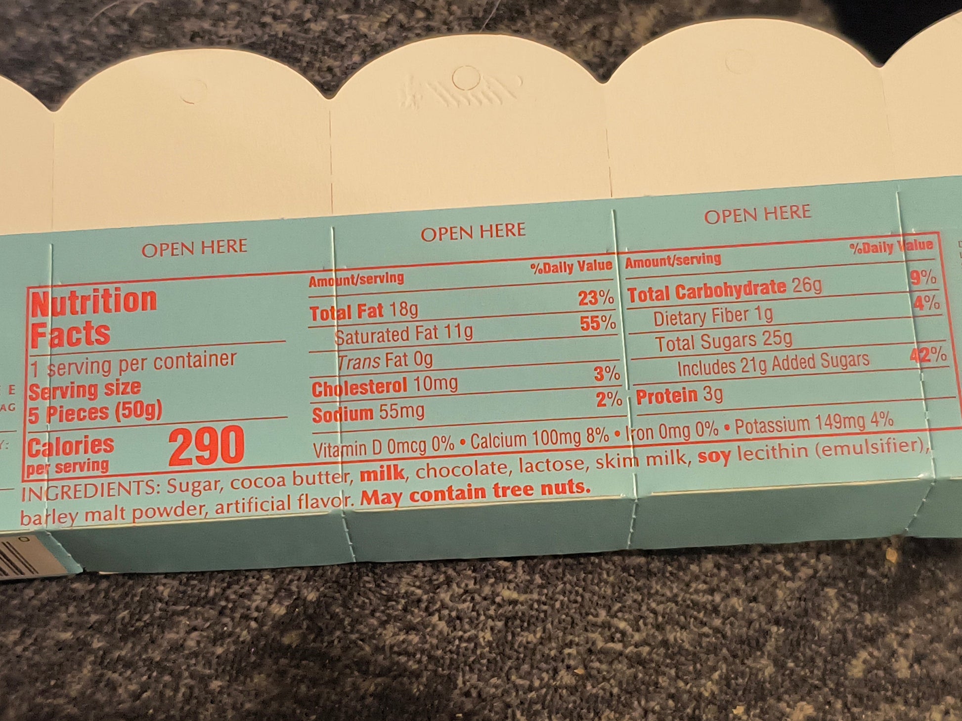 Allergy Information: Contains milk chocolate. Ingredients include sugar, cocoa butter, milk, chocolate, lactose, skim milk, soy lecithin (emulsifier), barley malt powder, and artificial flavor. May contain tree nuts. Please see product images for full nutritional details.